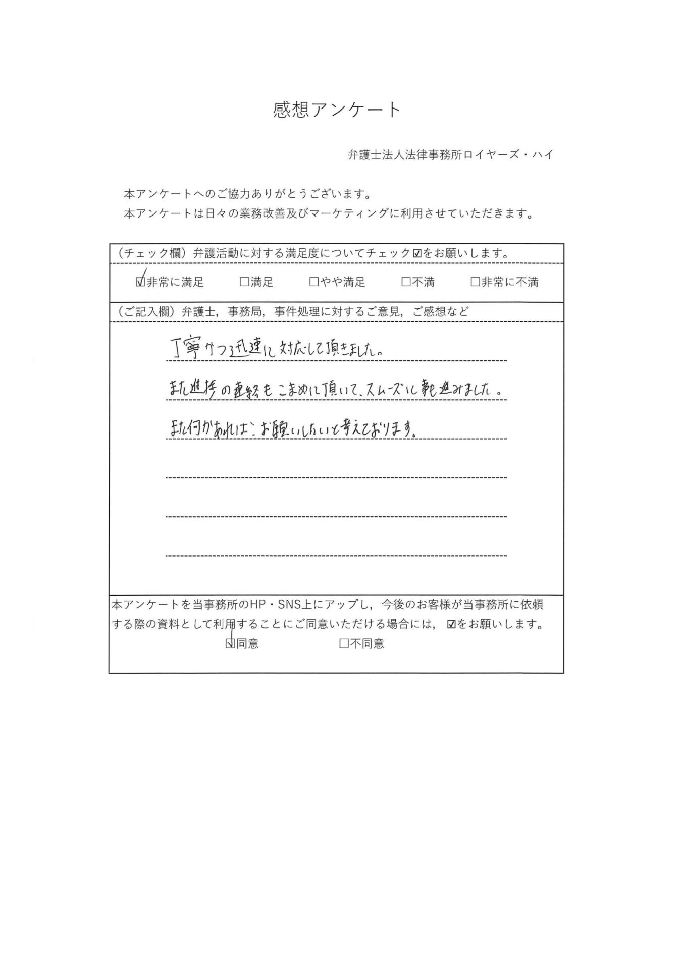 (30代 男性 会社員)「丁寧かつ迅速に対応して頂きました。また進捗の連絡もこまめに頂いて、スムーズに事も進みました。また何かあればお願いしたいと考えております。」
